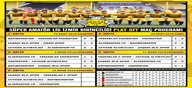 Sahadan galibiyetle ayrılan Aliağaspor, puanını 10 çıkartarak play off liginde liderliğe oturdu ve son maç öncesinde büyük bir avantaj yakaladı. 18 Nisan Çarşamba günü 9 puanla ikinci sırada yer alan İzmir Spor ile karşılaşacak olan Aliağaspor, sahadan puan ya da puanlarla ayrıldığı takdirde şampiyon olarak Bölgesel Amatör Ligi’ne çıkmaya hak kazanacak.