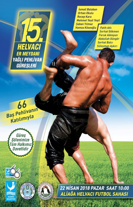 Aliağa Belediyesi ile Aliağa Belediyesi Helvacı Spor Kulübü işbirliğinde düzenlenecek olan ‘15. Helvacı Er Meydanı Yağlı Pehlivan Güreşleri’nde 66 başpehlivan ve 70 başaltı pehlivanı şampiyonluk için kıyasıya mücadele edecek. Türkiye’nin önde gelen pehlivanlarının yer alacağı güreş şöleninde, 656. Tarihi Kırkpınar Yağlı Güreşleri’nin şampiyonu İsmail Balaban ve finaldeki rakibi Orhan Okulu’nun yanı sıra; Recep Kara, Mehmet Yeşil Yeşil, Şaban Yılmaz, Hamza Köseoğlu, Fatih Atlı, Serhat Gökmen, Faruk Akkoyun, Abdullah Güngör, Serhat Balcı, Süleyman Aykırı gibi isimler de yer alacak.