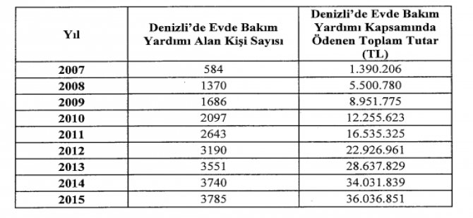 Kazım Arslan, yaşlı ve engelli aylığı dışında, Denizli’de, 2828 sayılı Yasa kapsamında evde bakım yardımı alan kişi sayısını da açıkladı. Buna göre; 2015 yılında toplam 3785 vatandaşa evde bakım yardımı yapılırken, toplamda 36 milyon 36 bin 851 Lira ödeme yapıldı.