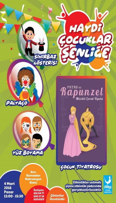 Aliağa Belediyesi’nin çocuklara yönelik düzenlediği ‘Haydi Çocuklar Şenliğe’ etkinlikleri tüm hızıyla devam ediyor. Avcı Ramadan Çocuk Oyun ve Rekreasyon Alanı’nda gerçekleştirilen etkinliklerde keyifli bir hafta sonu geçiren minikler için bu hafta ‘Prens ve Rapunzel’ isimli çocuk tiyatrosu sahne alacak. 4 Mart Pazar günü 13.00 ve 15.30 seansları ile ısıtmalı şişme çadırda sahnelenecek olan oyun ücretsiz olarak gösterime sunulacak.