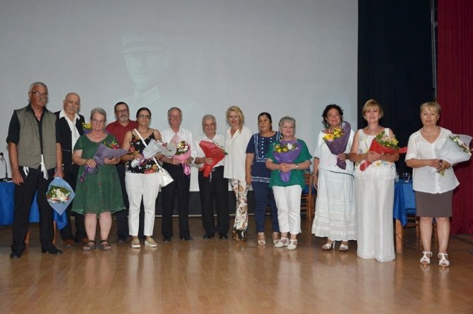 Foça Belediye Başkan Vekili Beyhan Türker, "Lozan ve Mübadele" etkinliğinde emeği geçenlere teşekkür çiçeği sundu.