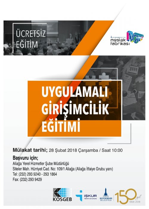 Küçük ve Orta Ölçekli İşletmeleri Geliştirme ve Destekleme İdaresi Başkanlığı (KOSGEB) uzmanları tarafından verilecek olan Uygulamalı Girişimcilik Eğitimine katılmak isteyen vatandaşlar başvurularını İzmir Büyükşehir Belediyesi’nin Siteler Mahallesi Hürriyet Caddesi No:109/1 (Belediye Benzinliği yanı) adresinde bulunan Aliağa Yerel Hizmetler Şube Müdürlüğü’ne yapabilecek.