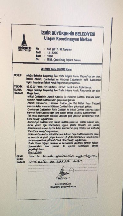 UKOME’nin 13 Aralık 2017 tarihli Genel Kurul Toplantısı’nda oy birliği ile alınan ve İzmir Büyükşehir Belediye Başkanı Aziz Kocaoğlu imzalı teknik kurul kararı gereğince;